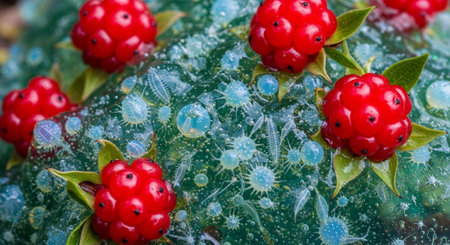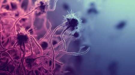 Discover the fascinating world of microbiology with this macro close-up illustration of bacteria and virus cells in a petri dish. Created using generative AI technology, this vibrant artwork captures the intricate details of these microscopic organisms.