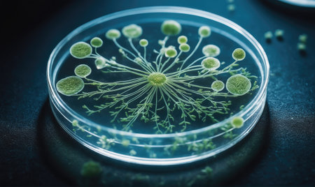 Top view of a petri dish containing diverse microorganisms, illuminated by soft lab lighting, with ample copy space for text or designs