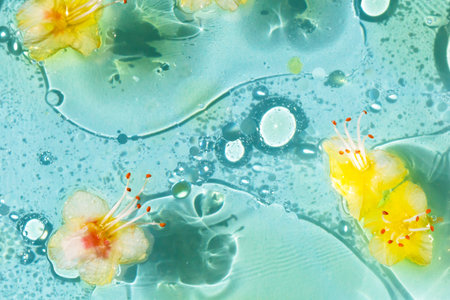 Chestnut flowers in yellow drops of oil in light blue water. Sun and shadows. Great background for your design