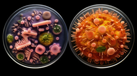 Explore the unseen with this captivating stock illustration capturing bacteria and virus cells in a petri dish. Generative AI brings the microscopic to life.