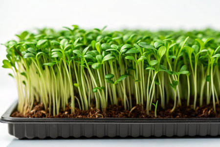 Microgreens growing in tray, lab grown food representing sustainable agriculture