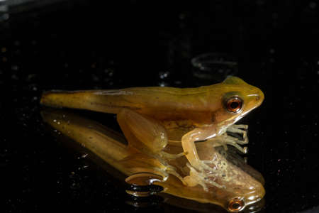 A baby common tree frog resting on a lotus leavw. The frog, also known as the striped tree frog, has the scientific name Polypedates leucomystax.