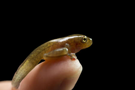 Woman holding a small forest frog toad close-up. People interacting with little wild reptile animal in Taiwan. Tiny baby of Hyla Chinensis tadpole is sitting on the finger. Care of environment concept.