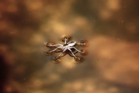 tiny frog peeking with eyes above water surface in small pond or puddle