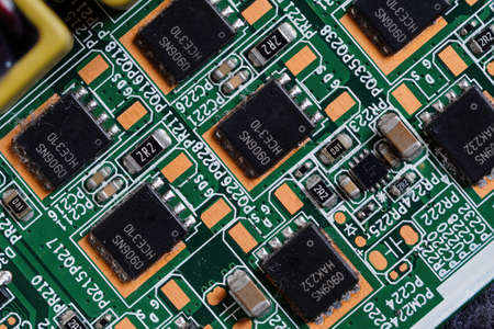 Macro shot of Circuit board with resistors microchips and electronic components. Computer hardware technology. Integrated communication processor. Information engineering. Semiconductor. PCB. Closeup