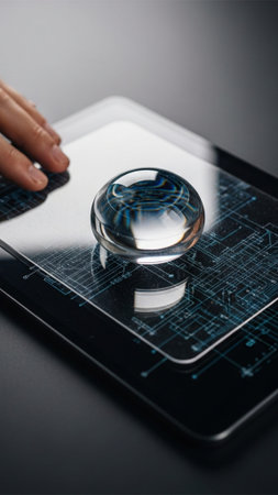 A person carefully holds a futuristic digital lens with a holographic pattern glowing on its surface.