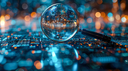 Magnifying glass on electronic circuit board with bokeh lights.