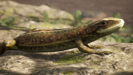 A viviparous lizard stands on a rocky shore on a sunny morning. A lizard standing on a stone in a typical habitat. 3D Rendering.