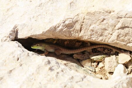 Little green lizard hid in a stone crevice.