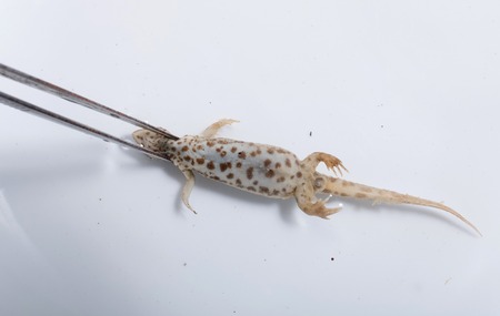 A dead newt is held by tweezers as part of a biology lesson