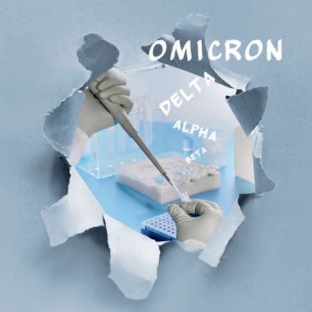 Omicron, new Coronavirus variant of concern. Paper hole with image of scientist making sequencing reaction to identify corona virus variants.