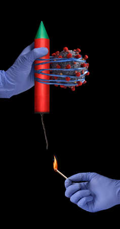 Coronavirus molecule tied to a rocket to expel it away.Lighting on the rocket to expel the virus
