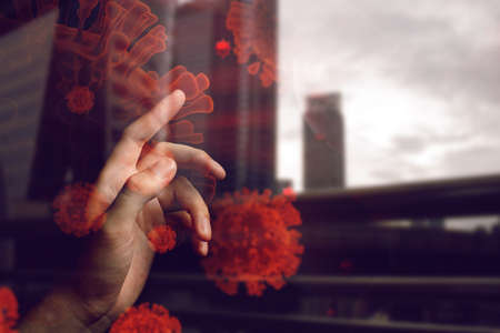 people hand touching blood dna of structure virus crisis outbreak pandemic biohazard cell atom disease syndrome infection