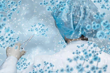 Molecule research study concepts. Doctor examines molecules with a tool on a blurred background.