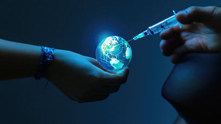This image illustrates a powerful concept of global health through hands holding a glowing Earth and a syringe, symbolizing hope in medical advancements and vaccinations.