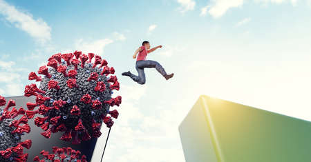 End of Coronavirus Covid-19 virus pandemic. Man jumping to new normal world concept