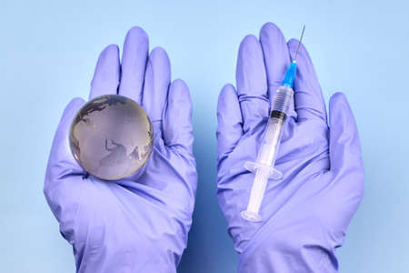 Woman's hands in medical gloves is holding a planet earth globe and a syringe, the concept of vaccination.