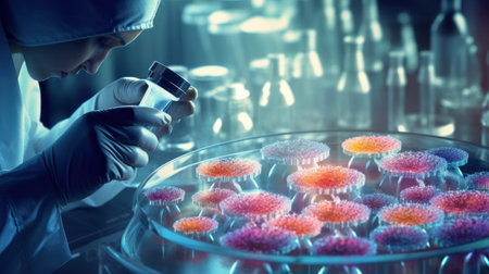 Gloved hands of a scientist examining vibrant microbial colonies in petri dishes, conducting research on infectious diseases and developing new treatments