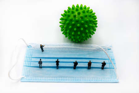 Miniature figurines posed as business people standing socially distanced on medical face mask in a meeting looking at spiky ball as coronavirus representation, minimalist abstract concept