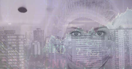 Composite image of financial data processing against caucasian female surgeon wearing surgical mask. global finance and healthcare concept