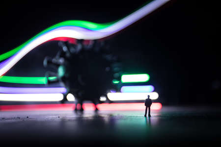 Corona virus global pandemic concept. Miniature man standing near big Corona virus novel in dark. Creative decoration with fog and backlight. Selective focus