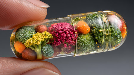 A Colorful fruits and vegetables inside clear capsules arranged in lines, showcasing vibrant colors and detailed textures