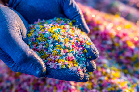 The man has it in his hand crushed colorful recycled plastic . Plastic for further processing.Recycle! Cleaning up nature is expensive. Orange, blue, black, red and white bits of crushed plastic.