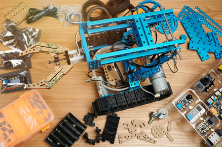 Programming classes theme. Robotic school background. Robot on table with parts around