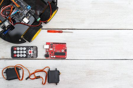 Back to school concept. A metal robot and an electronic board that can be programmed. Robotics and electronics. DIY robotics. STEM and STEAM education for kids. Free space for text.