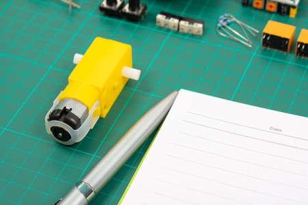 Small dc motor and an electronic board that can be programmed. Laboratory in the school. Microcontroller boards for stem education.