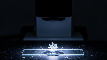Geometric pattern of an individual snowflake magnified under a microscope, captured as an extreme wi