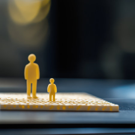 Two yellow plastic figures stand on a patterned board showcasing a thoughtful connection in a creative workspace filled with warm light.