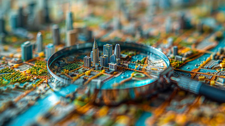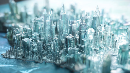 An artistic crystal cityscape model displays a detailed arrangement of skyscrapers and buildings, showing intricate architecture against a blurred background, evoking a futuristic ambiance.