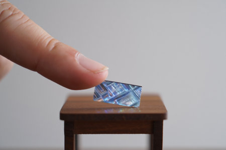 Placing acrylic block. Miniature wooden table demonstrates design. Simple setup.