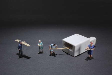 Miniature people. Business men stand near disassembled parts of an electronic device. Business entrepreneur concept