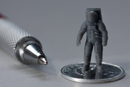 A closeup shot of a coin, a 3d printed astronaut figurine, and a pen on a white surface
