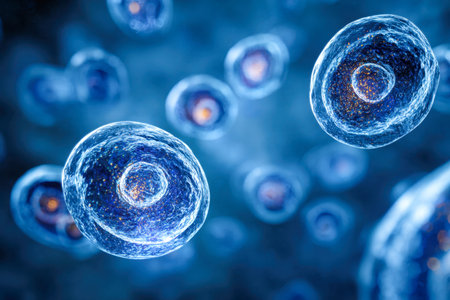 Intricate depiction of various cellular structures with prominent nuclei floating within a vibrant blue milieu, symbolizing advancements in biomedical exploration and cel