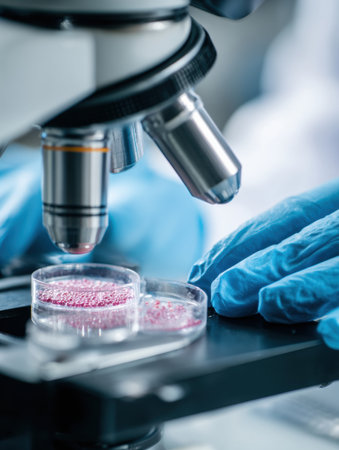 Scientist in laboratory examines cell cultures through a microscope, utilizing modern equipment for meticulous research and observation in biological study.