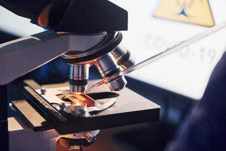 Close-up of scientific microscope. Laboratory in hospital. Epidemic disease, healthcare, vaccine research and coronavirus covid-19 test.
