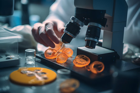 food microscopy technology, close-up of microscope in use for food quality testing, demonstrating advanced tech to maintain top food safety and quality standards