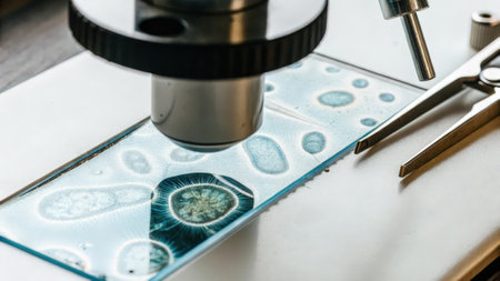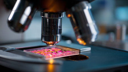A microscope is analyzing biological samples on a glass slide in a modern lab environment.