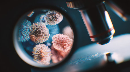 Colorful microorganisms are seen through a microscope lens in a laboratory. The intricate details and varied textures highlight the complexity of these life forms