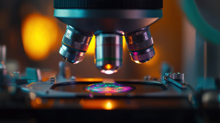 Scientific examination of colorful samples under a microscope in a laboratory setting