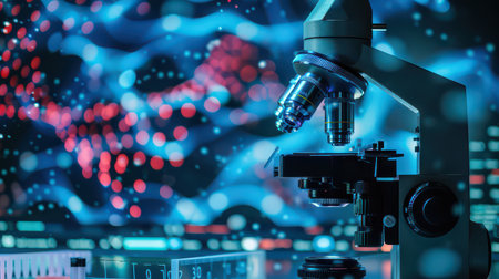 A microscope glows with blue lights against a sparkling bokeh background, symbolizing scientific exploration.