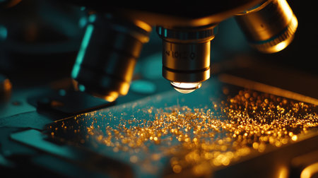 This close-up image showcases a microscope lens with a droplet resting on a surface of shimmering golden particles, highlighting the beauty of scientific exploration.