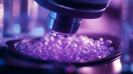 A close-up of a microscope lens focused on vibrant, luminescent bubbles, showcasing intricate details in a scientific setting.