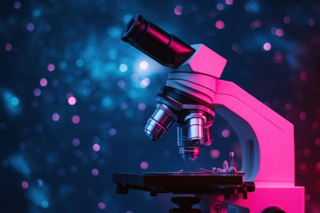 A microscope sits on a colorful surface, illuminated by pink and blue lighting, representing scientific inquiry.