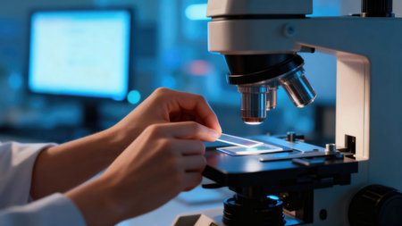 A microscope is analyzing biological samples on a glass slide in a modern lab environment.