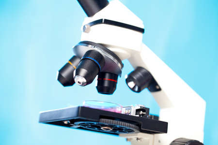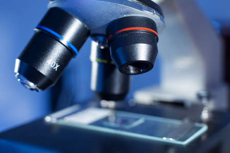 Close-up of scientific microscope. Laboratory in hospital. Epidemic disease, healthcare, vaccine research and coronavirus covid-19 test.