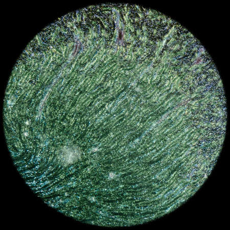 Scientific or medical test sample under light microscope in laboratory, close up.